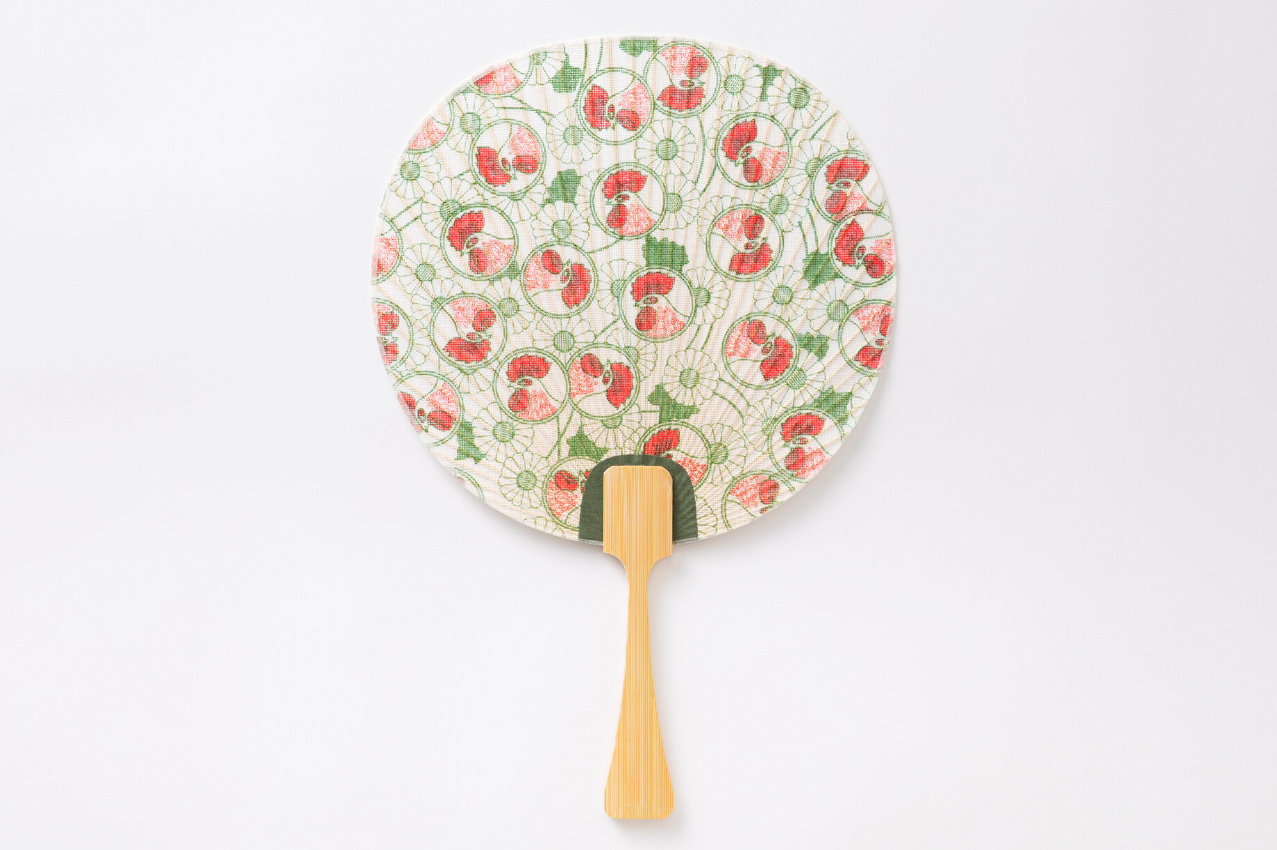 「金鳥の渦巻」でおなじみの鶏の絵柄を全面にデザインしたかや織の生地で、うちわをつくりました。日本の夏を楽しむ、遊び心のあるうちわです。