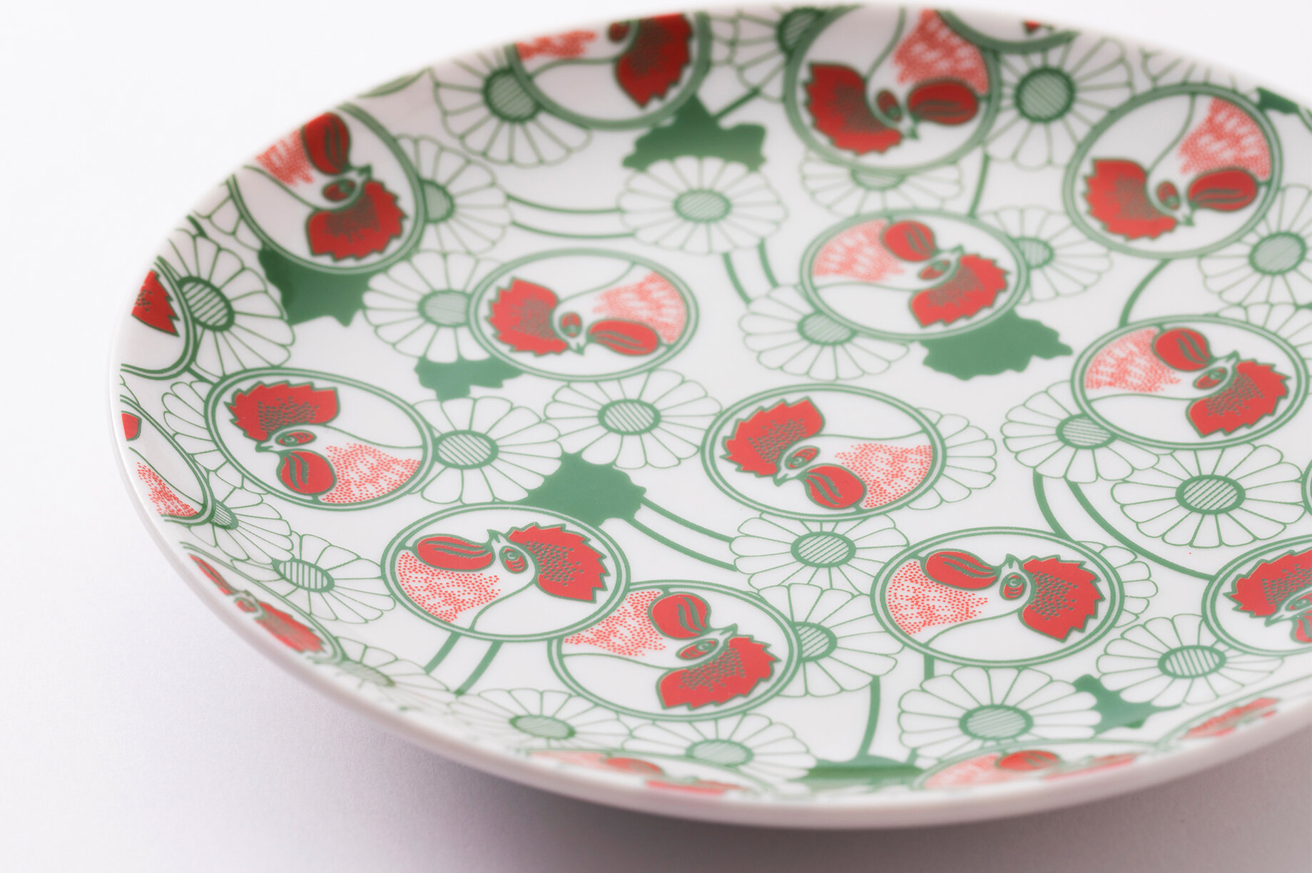 「金鳥の渦巻」に描かれた鶏の絵柄を全面にデザインした九谷焼の小皿です。江戸時代に石川県南部に誕生した古九谷をはじまりとする九谷焼。蚊取り線香の受け皿としてもお使いいただけます。