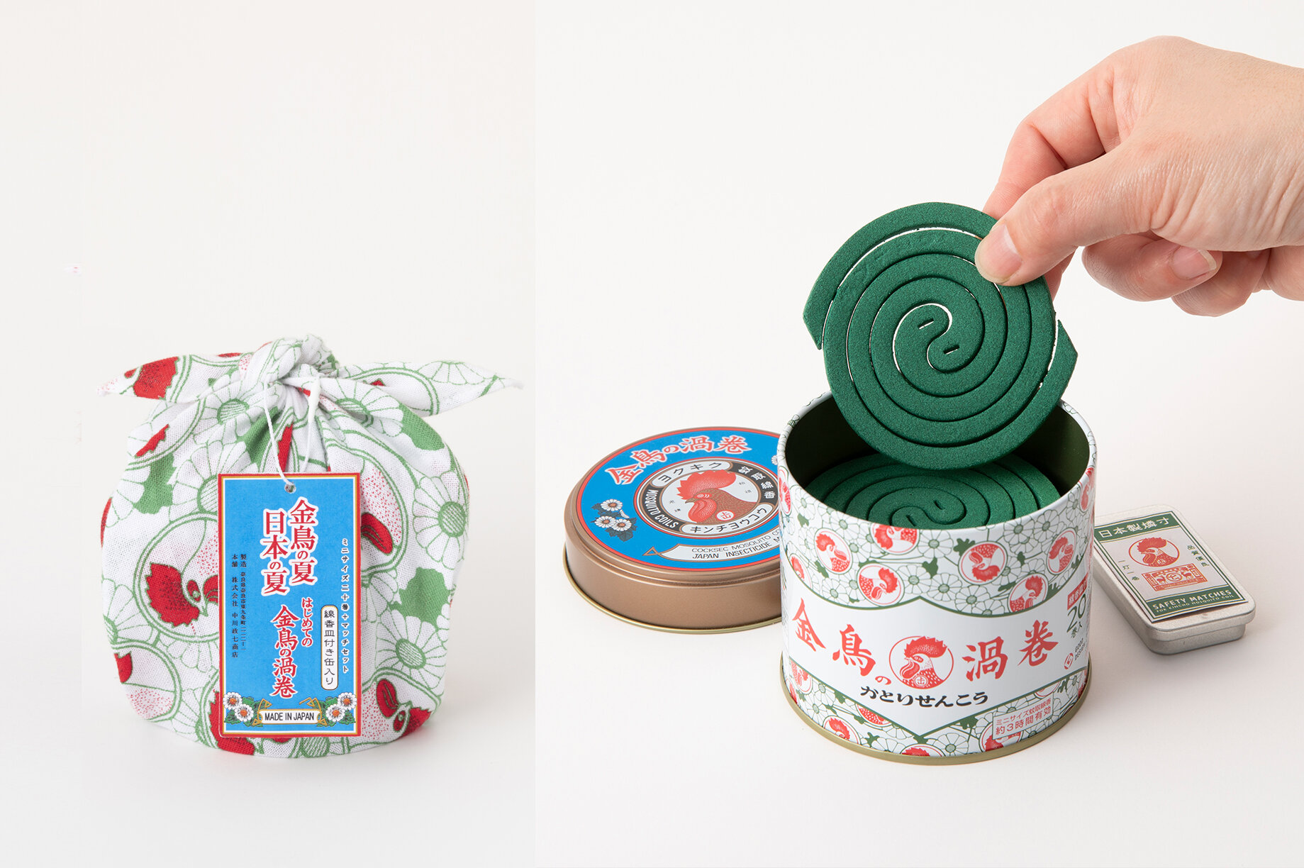 蚊取り線香「金鳥の渦巻」の缶入りミニサイズを、おなじみの鶏の絵柄を全面にデザインしたハンカチに包みました。オリジナルの缶入りマッチも付属しているので、このセット1つあれば蚊取り線香をすぐに使い始められます。