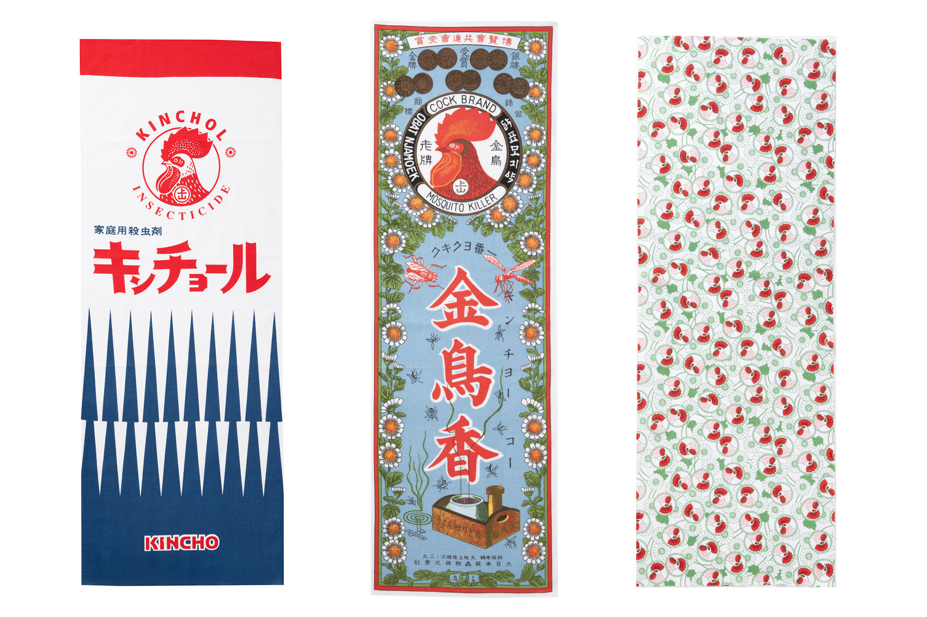 殺虫スプレー「キンチョール」や世界初の棒状蚊取り線香「金鳥香」、おなじみの鶏の絵柄を全面に描いた遊び心のあるデザイン。手捺染という技法を用い、細かなところまで丁寧に表現しました。