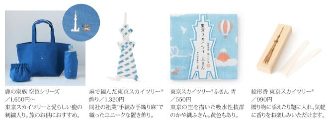東京スカイツリー®の限定商品をフルラインアップでご用意しました。東京スカイツリーと鹿の刺繍を施した「鹿の家族空色シリーズ」や、中川政七商店の祖業である手績み手織りの麻生地を用いた「麻で編んだ東京スカイツリー®飾り」、東京の空が賑やかに描かれた「東京スカイツリー®ふきん」など、お土産にぴったりの品々が並びます。東京を訪れた記念に、ぜひご覧ください。