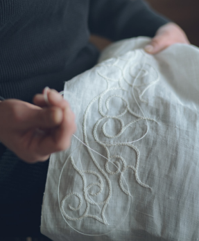 刺繍の製法には、アイヌ民族の伝統技法である手刺繍の「イカラリ」や「オホカㇻ」を取り入れ 、また手作業では難しい2メートルに及ぶ大判サイズは機械刺繍で 表現 。繊細な手刺繍の美しさと、インテリアに存在感を与える大判の機械刺繡、それぞれの違いもお楽しみください。
