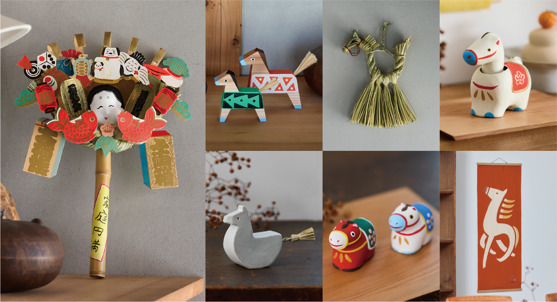 一年を通して家を見守ってくれると言われる干支飾り。午年は、"うま"くいくという言葉に通じることから、物事が順調に進む年とされ、また馬は力強く駆ける姿から活力・成長・飛躍の象徴ともいわれています。信楽焼や張子など日本の工芸を生かしてつくりました。