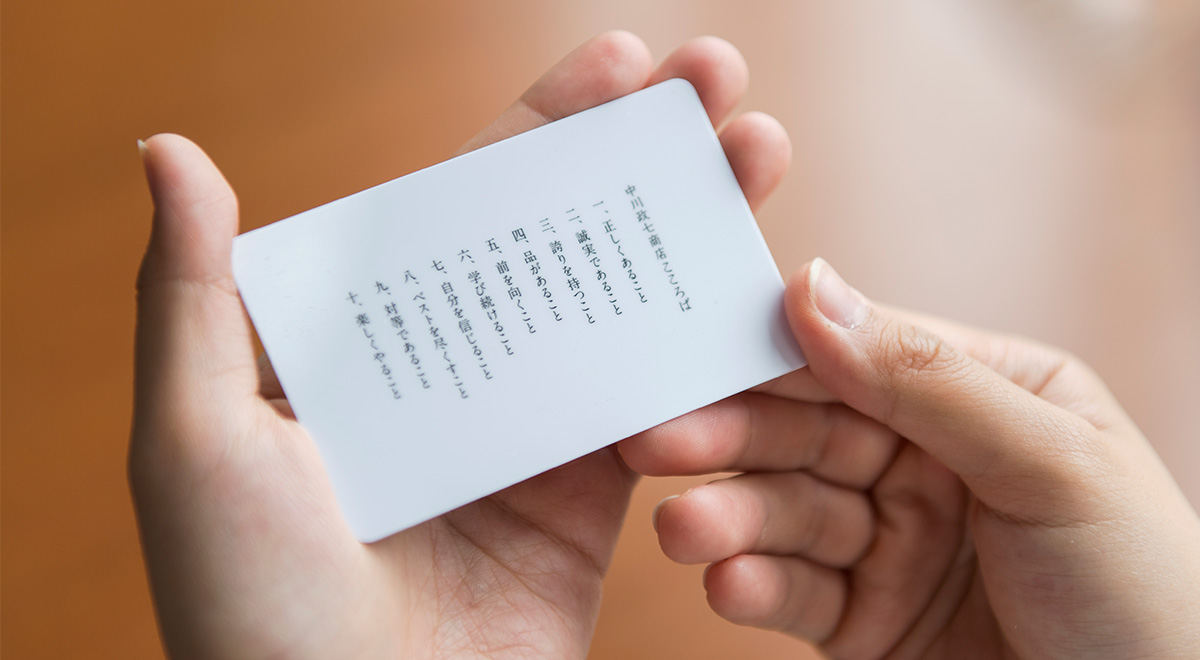 中川政七商店で働く全員がひとりの人として、仕事をする上でも、私生活でも、生きていく上で持ち合わせたいこころ。わたしたちはそれを「こころば」と呼んでいます。「正しくあること」からはじまる十の言葉は、一人ひとりの解釈を重ね合わせながら、わたしたちを繋いでいます。
