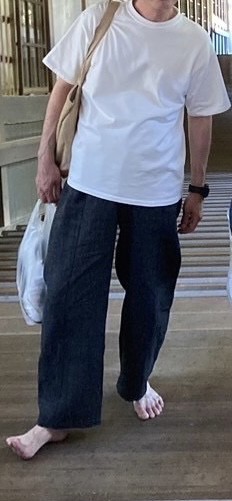 実は生成りを購入する前に墨を購入してます。身長178cmでMかLか迷いましたが、Lの方が幅が太くてかっこいいのでLにしました。割と細身なので付いている紐で結えるかベルトをしないとパンツがずり落ちてきます。しかし着用すれば必ずやモデルの方みたいな違う自分になれます。僕は墨ならザの白色なオフTシャツ、生成りなら黒色でコーディネートしています。パンツは墨と生成りの両方ともおすすめですが、同じ色のスキッパーと合わせるのは嫌ですね。今度違う色のスキッパーとのコーディネートを試してみます。
