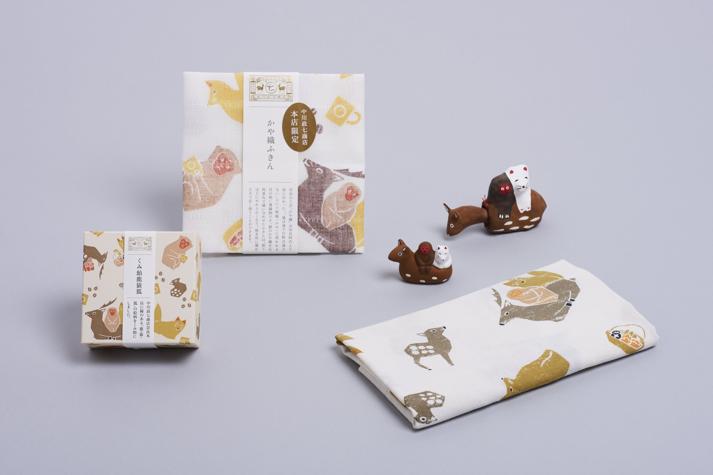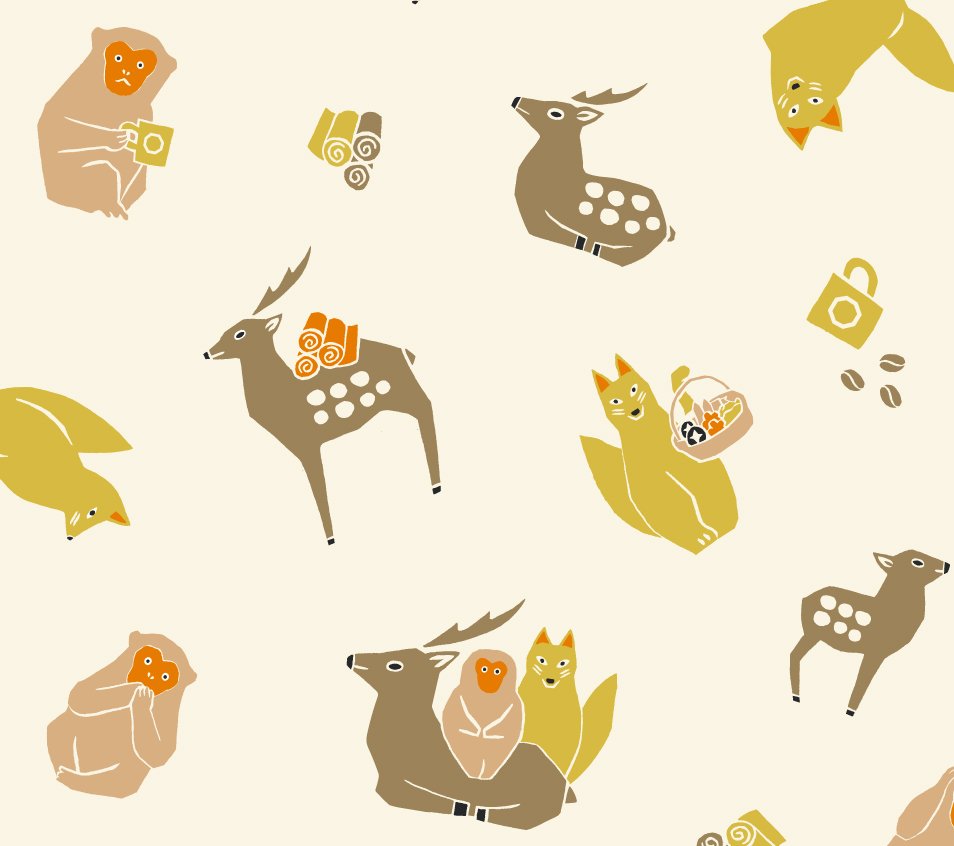 3匹が寄り添う姿だけでなく、麻の反物を背負う鹿やコーヒーマグを手に取る猿、すき焼き鍋を持ち手招きする狐など、それぞれの店の特徴にちなんだユニークな絵柄も。鹿猿狐ビルヂングを訪れる記念となるような品々です。 ※同店限定品