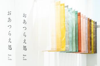 20色の麻生地から選び、タペストリーや座布団などの小物が注文できるおあつらえカウンターを設置。生地24m分を織り上げるのに1か月以上かかる希少な「手績み手織りの麻生地」。暮らしに取り入れることで、手仕事によって生まれる工芸の美しさを身近に感じていただけます。