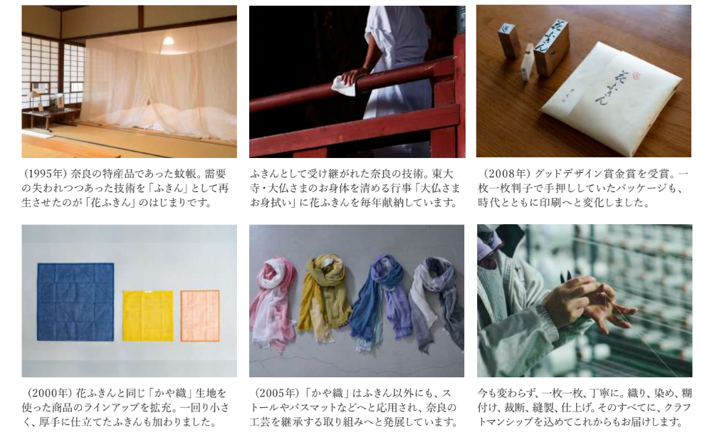かつて、奈良の特産品であった蚊帳。目の粗い生地でできた蚊帳は、日本の夏の風物詩でした。時代と共に需要が減ってきていた蚊帳の吸水性・速乾性に着目し、美しく機能的なふきんとして商品化したのが「花ふきん」のはじまりです。節目の年に、その歴史とこれからをご紹介します。
