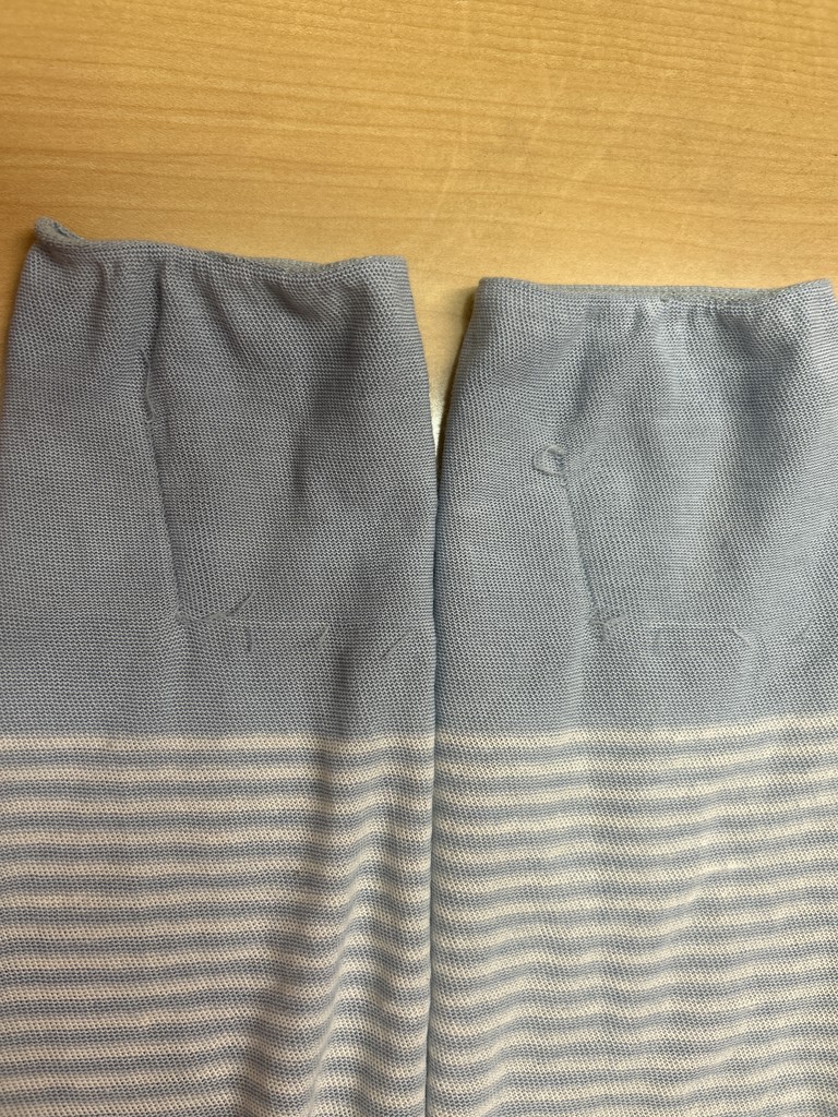 初めから、この色!と決めていました。職業柄、年間通して半袖なんです。ここ最近、肌寒くなってきたので長袖シャツを着るまででもなく、保温の為に初めて手を通した所、3センチ程の伝線したようなら跡がありました。片方だけ?と思ったら両方ともでした。これって普通なのでしょうか?親指を通すと、小指側の甲になるので目立たないといえば目立ちませんが、気になりました。
