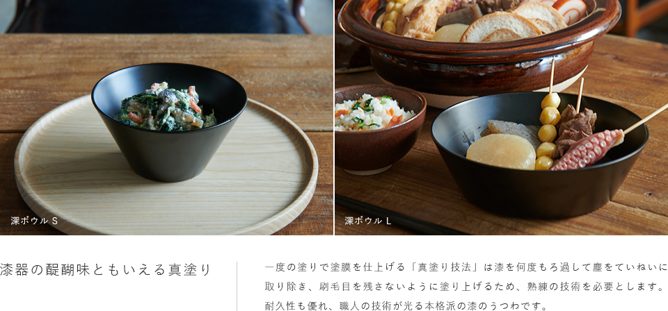 漆が最も硬くなるのは塗り上げてから100年後ともいわれ、完全硬化には長い年月を要します。「越前硬漆」は福井県、福井大学との産学官の連携によって堅い塗膜を実現した、食器洗い機にも耐えうる漆。現代の食生活にも沿うように独自の形状と美しい彩りに仕上げており、日用の食器としてお使いいただけます。