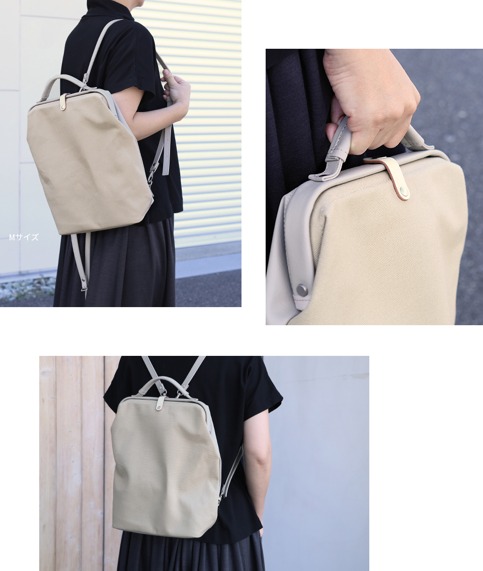 口金を使って、大きく口が広く開くバッグは、携行品の多い医師が使うことから欧米ではドクターズバッグと呼ばれています。厚手で網目の荒い素朴な雰囲気の4号帆布を使用。ホック一つで大きく開き、物の出し入れがしやすいです。底は2重で、間に底板が入っており、重いものを入れても型崩れしにくいところもうれしいポイント。