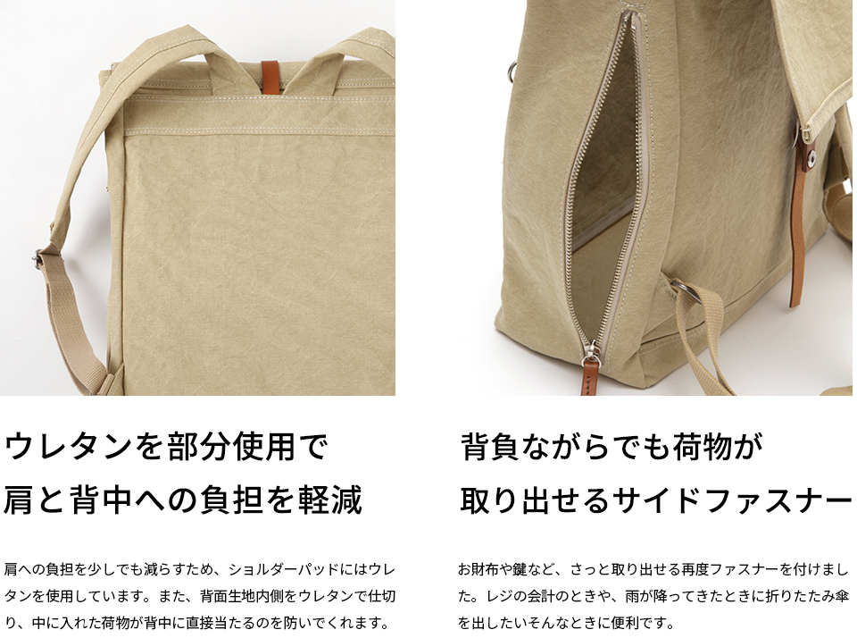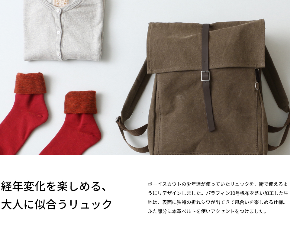 ボーイスカウトの少年達が使っていたリュックを、街で使えるようにリデザインしました。柔らかい8号帆布バイオウオッシュ加工の生地は、表面に独特の折れシワが出てきて風合いを楽しめる仕様。ふた部分に本革ベルトを使いアクセントをつけました。