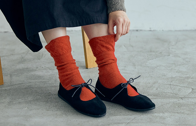 寒い季節も心強いあたたかな履き心地の、冬のしめつけないくつした。通気性・保湿性に優れた、軽くてやわらかいウール100%の糸を表糸に使用しました。ストレッチ性の強い糸は使わず、細い糸を2本合わせて編むことで、足をやさしく包み込むような履き心地に仕上げています。またゴムの位置を少し下げて、皮膚と接するラインをソフトにしています。やぶれやすいつま先やかかとには補強糸を入れて強度を持たせ、底はクッション性を高めるために2重に編んでいます。