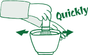 茶筅を“茶碗の底”に当て、前後にシャカシャカ素早く大きく振り泡立てます。Whisk quickly in an "I" shape at the bottom of the bowl to foam it.