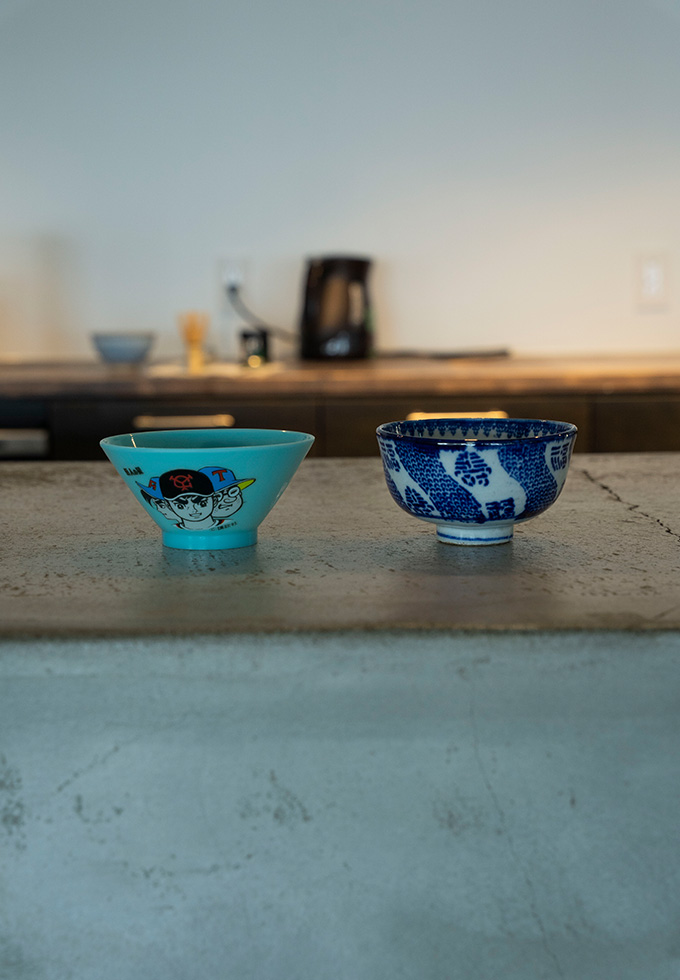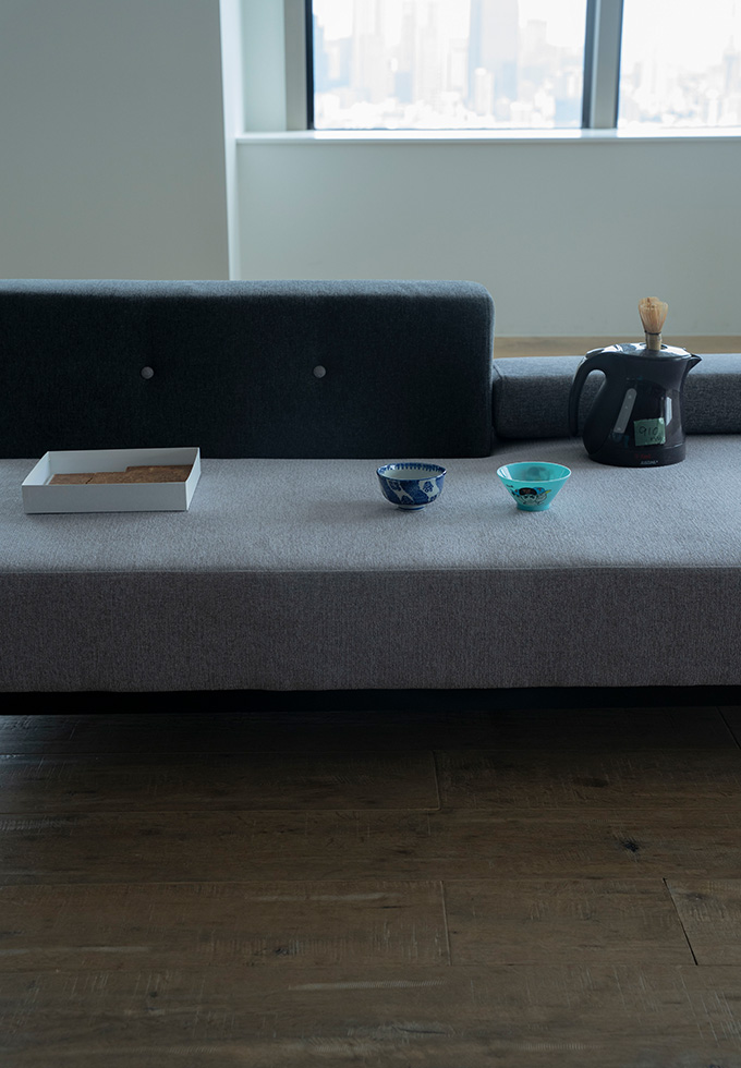 「たとえば今日のソファーも、ちょうど同じような広さなので『待庵』に見立てられる。なんでもこじつけていくと楽しいんです。プラスチック製のお茶碗にも元ネタがあって。お茶の世界で重用されている『井戸茶碗』が、もともと朝鮮半島で量産されていた日常のうつわだということにちなんで、敢えてプラスチックのものを使っています」