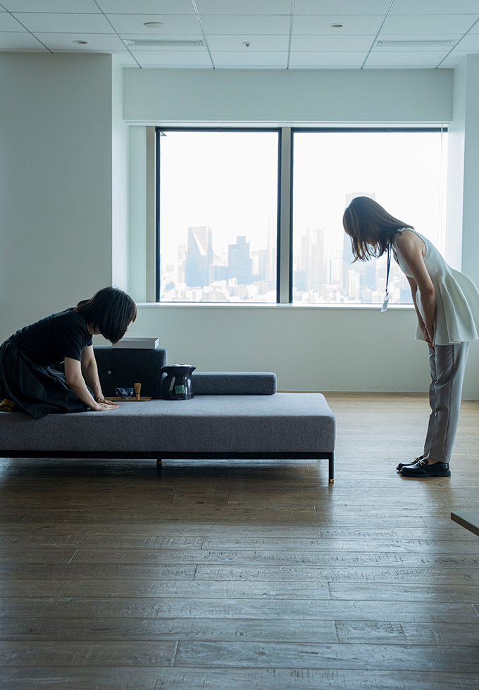 そう言って、茶会の場所を軽やかに決めていく谷田さん。オフィス内のフリースペースにあったソファーを茶室に見立てて、茶会がスタートしていきます。