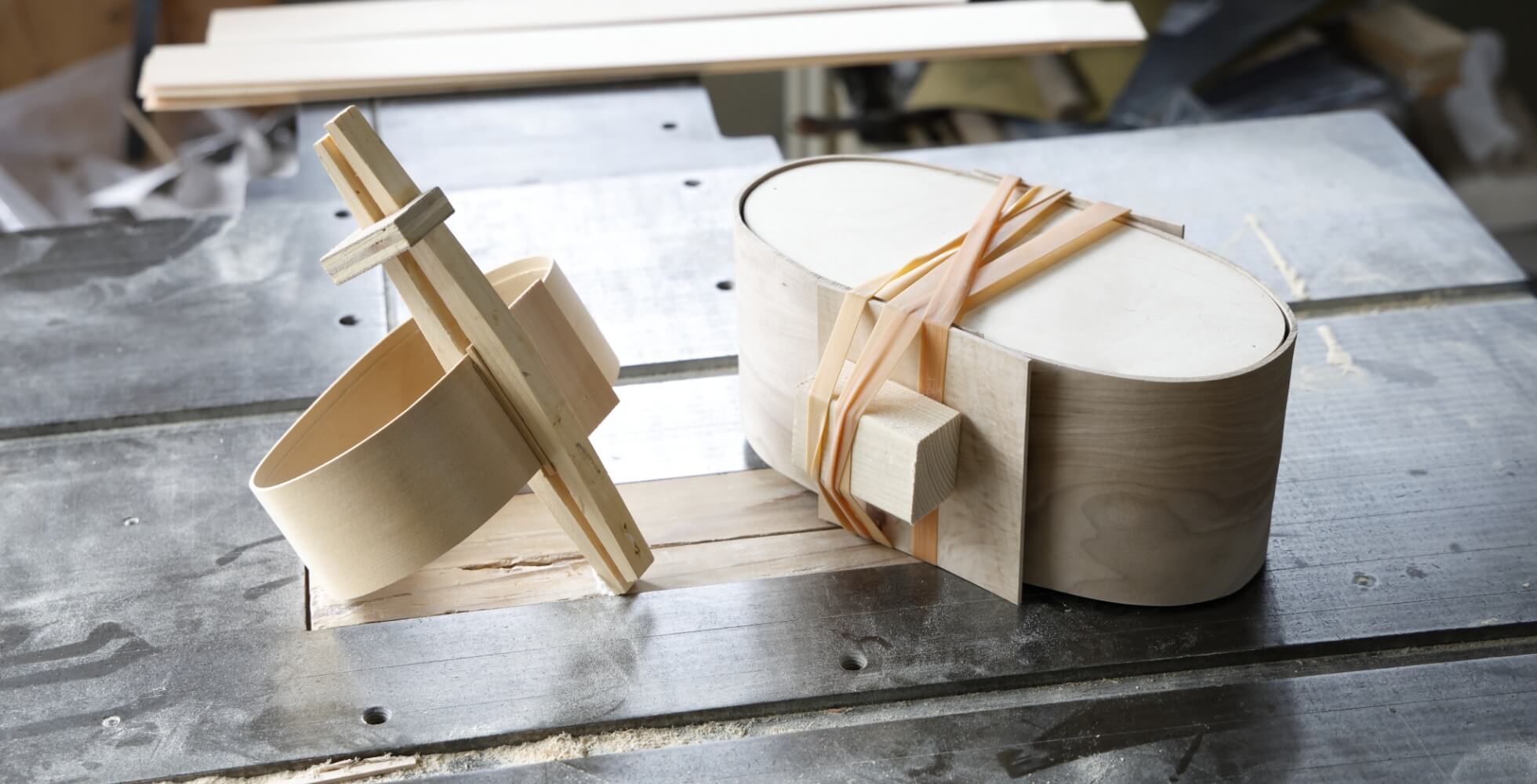 こうして伐採・集積され、製材された支障木をわっぱケースの形にするのは、静岡の伝統工芸品「めんぱ」職人による曲げ木加工。