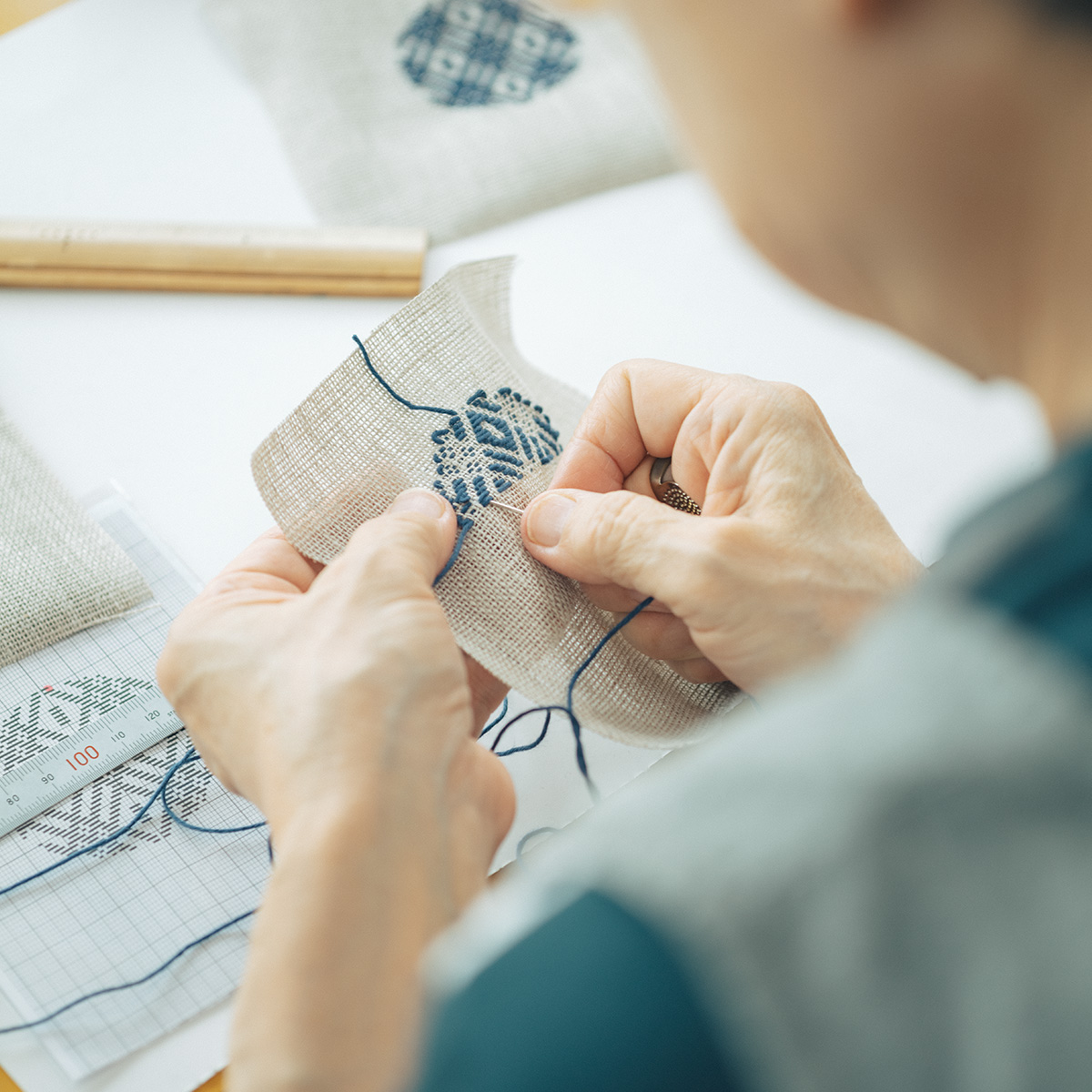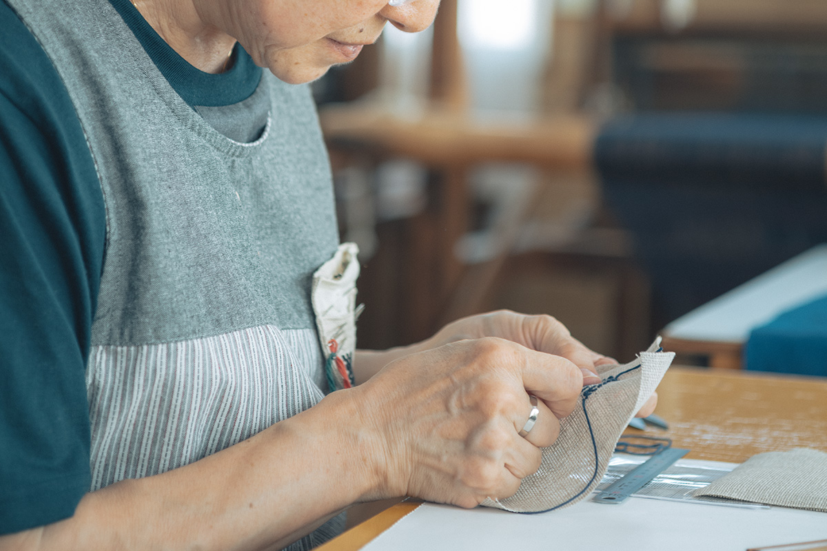 こぎん刺しは「刺し子」の一種とされていますが、ほかの地域で見られる針仕事と大きく異なる点があります。それは、下地となる生地の経糸1本1本の目を数えながら、緯糸に沿って、織物の目と目の間に正確に刺していく緻密な技法であること。