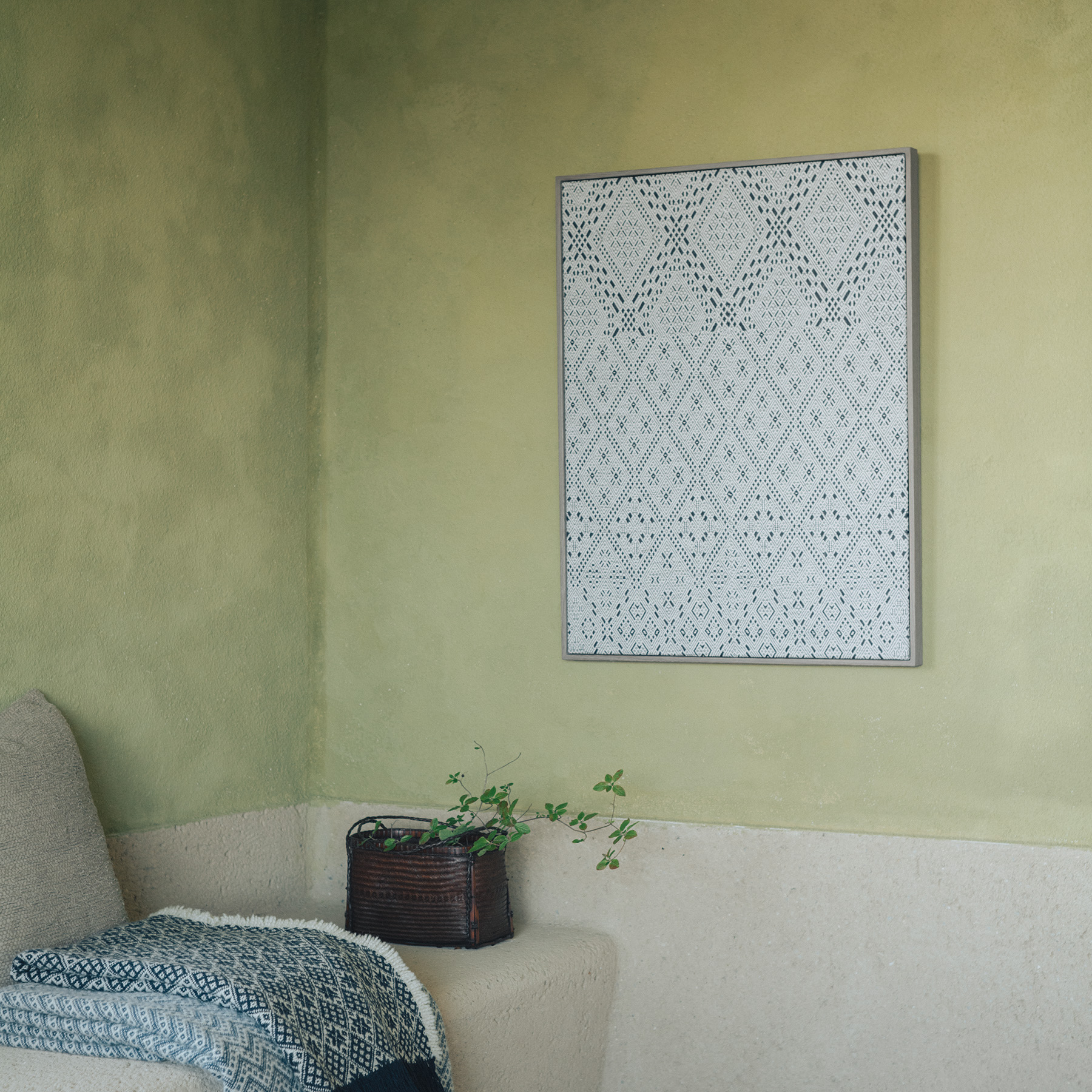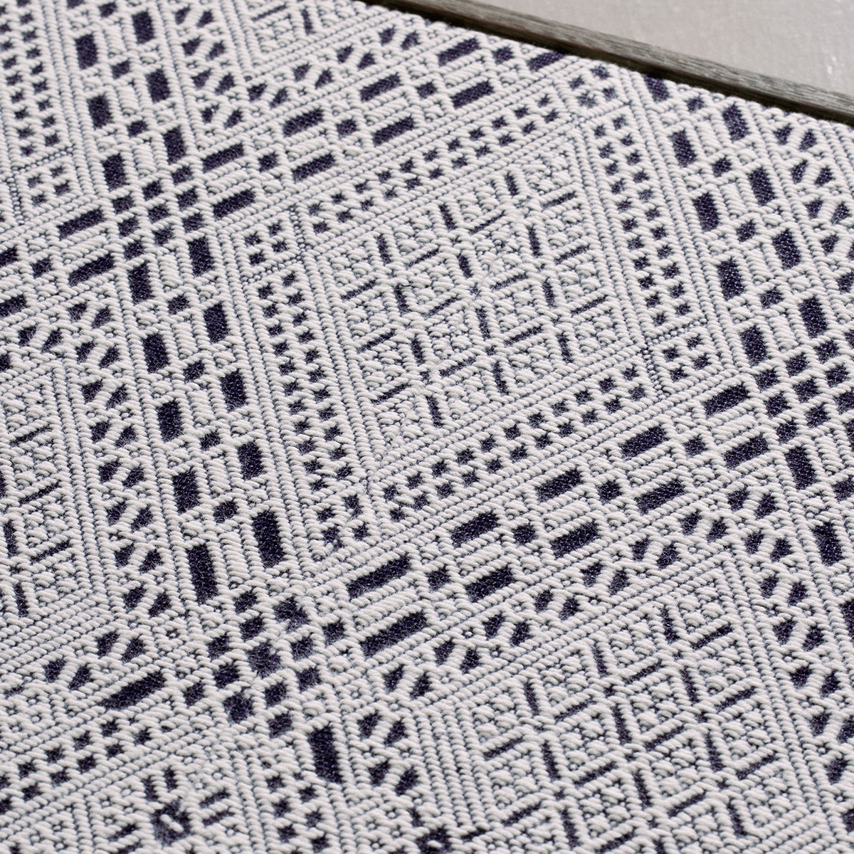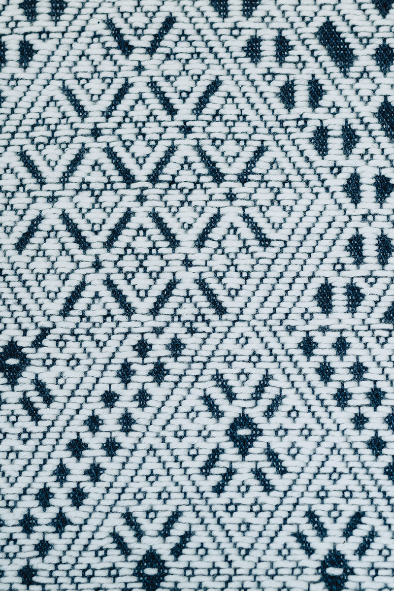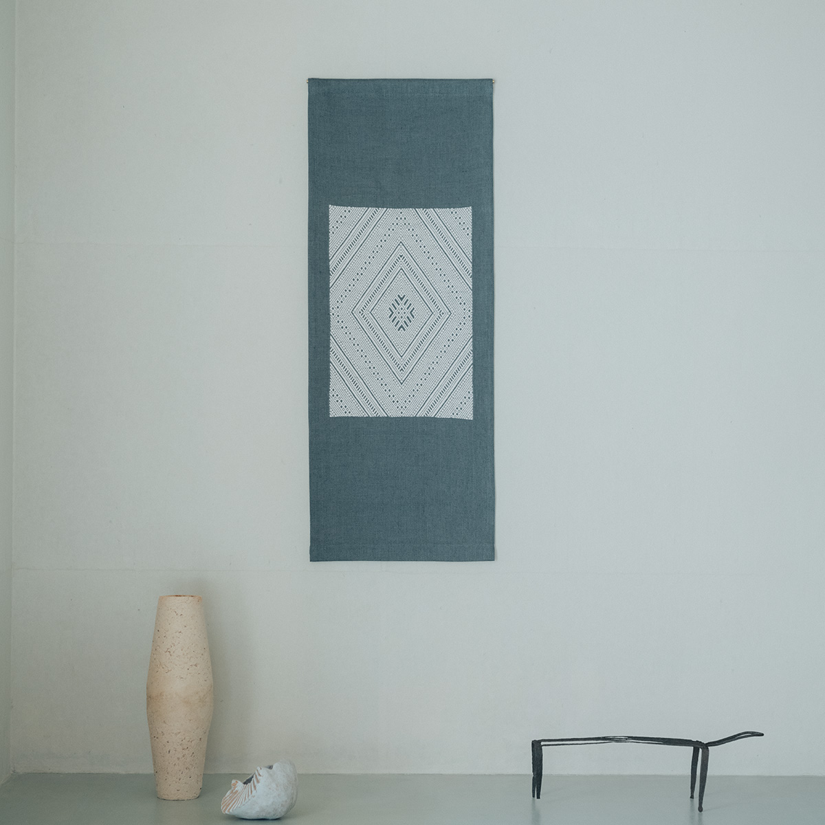 ごぎん刺しは刺し子のひとつであるものの、その数学的な構成から一見織物に見えることもあり、現在では「ごぎん 織」といいうぎん風文様の織物も作られています。また日本だけでなくアジアやヨーロッパにもごぎんに似た織物が存在し、文様そのものを見れば、どことなく国の文化を越えた雰囲気も漂います。織物の特性を生かし、精緻なごぎん刺しとはまた異なった、柔らかく表情豊かな 生地が織り上がりました。