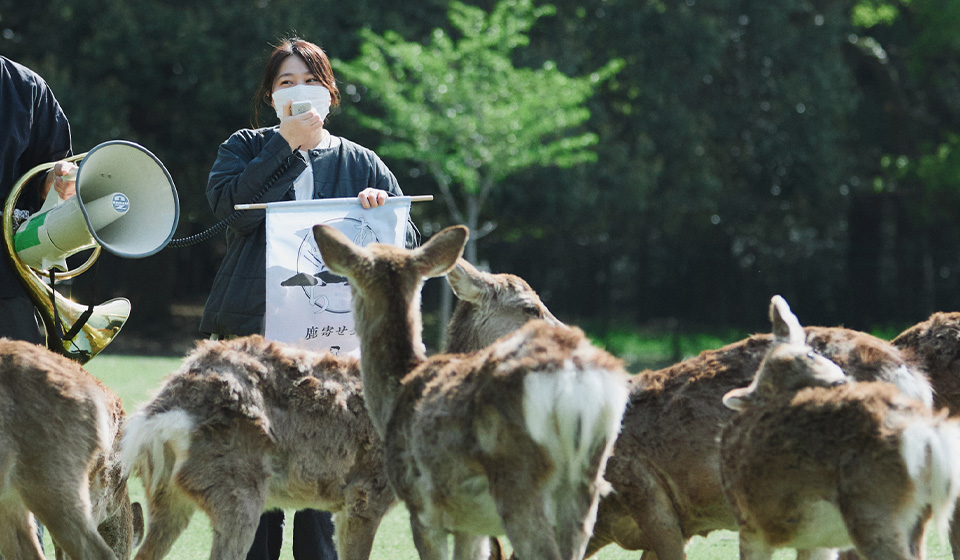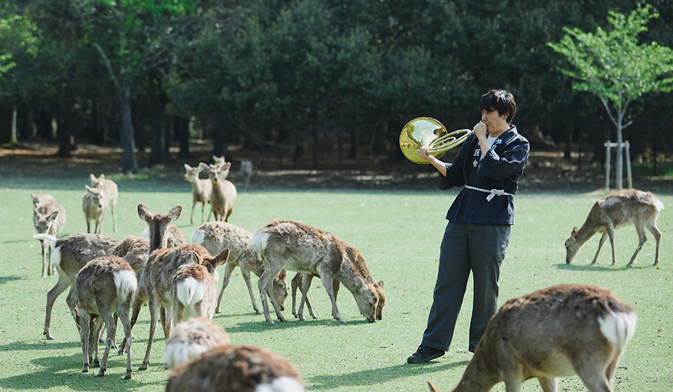 ナチュラルホルンの音色に誘われて、たくさんの鹿が森から駆け寄ってくる催し「鹿寄せ」。迫力満点、奈良公園の風物詩です。鹿猿狐ビルヂングによる主催で、全6日間開催いたします。