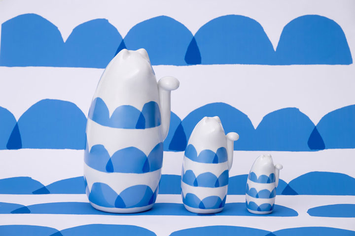 そんな瀬戸の地で、明治時代後半から長きに渡り創り続けられてきた瀬戸焼の招き猫を、現代の多様な暮らしに寄り添い、より多くの皆様の側で幸せを招く存在となる新しい招き猫のカタチ「SETOMANEKI」。テキスタイルデザイナーの鈴木マサル氏とのコラボレーションシリーズが並びます。