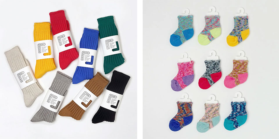 くつ下工場として100年の歴史を持つ創喜。創喜の靴下は、ふっくらと足を包んで、素材のよさを最大限に味わえます。組み合わせる糸の種類で、はき心地もいろいろ。その魅力にワクワクしながら、そのワクワクが多くの人に伝わるように職人がひとつひとつ丁寧に編みあげています。 贈る言葉を大切に温めてくれるメッセージカード「プチックス」もご用意。