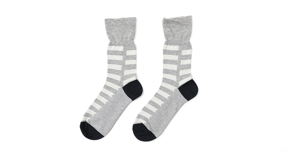 靴下の生産量日本一・奈良県の技術を生かした機能的な靴下は、ボーダーを段違いにすることで、横断歩道を表現しました。(1,300円/税抜)