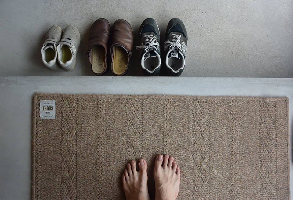 我が家の玄関の床はモルタルで、硬質でシンプルなのがいいと思っていました。でも冬にどうしても冷たい印象があると妻に乞われて、ラグを導入。この時に選んだのがCOURT (コート) のウールラグです。