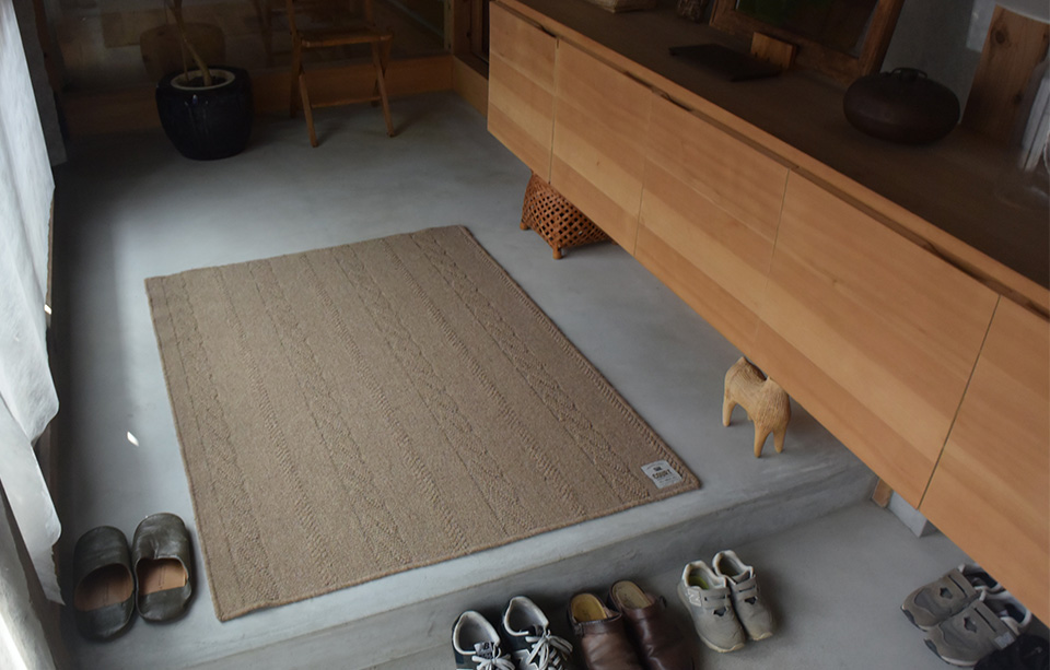 いざ、敷いてみると玄関の印象が一変。フィッシャーマンズセーターのような織り模様が空間にアクセントを与えてくれます。